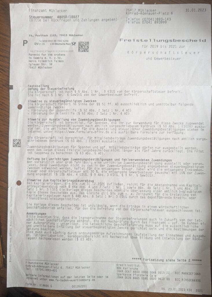 Mit Freistellungsbescheiden durch die Finanzbehörden wurde lückenlos festgestellt, dass der Verein den Satzungen entsprechend auch weiterhin arbeitet und förderungswürdig ist. Der letzte Bescheid erging am 31.01.2023 – gültig bis 31.12.2026 -Spendenbescheinigungen dürfen demgemäß weiterhin ausgestellt werden. Der Tätigkeitsbericht wurde akzeptiert. Eine Verlängerung ist beantragt.